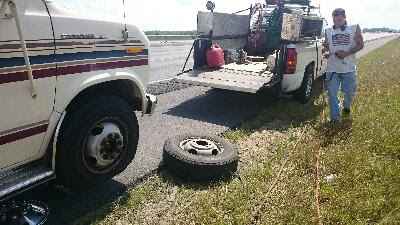 Après 2-3h de route, Elvis est à l’arrêt: 1 pneu avant crevé !