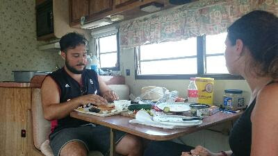 Aude & Normann préparent les casse-croûte pour ne pas s’arrêter et perdre de temps.