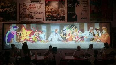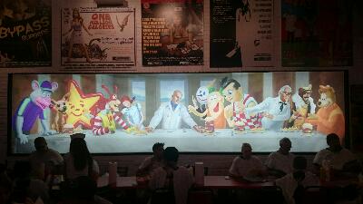 Il annonce clairement la mal bouffe en se moquant des grandes chaînes comme MecDo, KFC, Burger King etc… Qui prétendent par leur pub que c’est sain, équilibré etc…