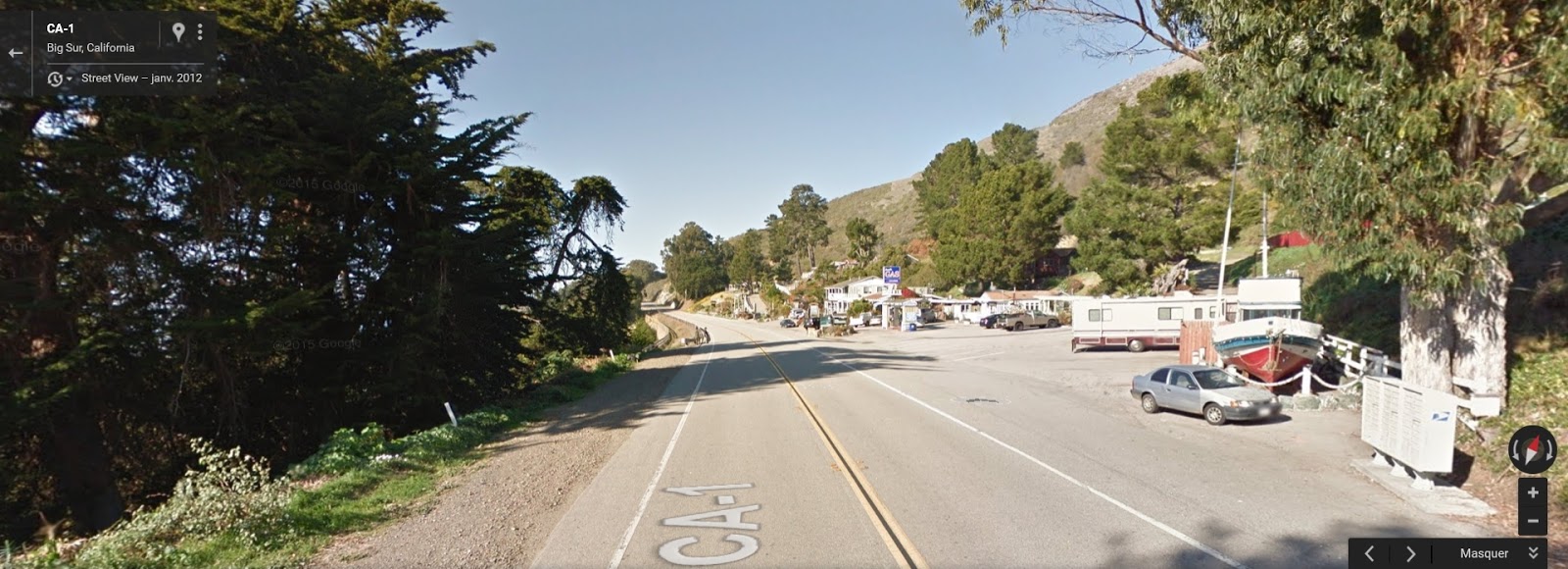 Euh… Comment dire, on arrive sur un parking en bord de route (Pacific Coast Highway), mais ce dernier regroupe un hôtel, un bar, un restaurant, une épicerie, une station service etc…