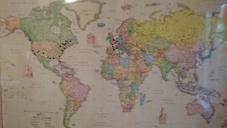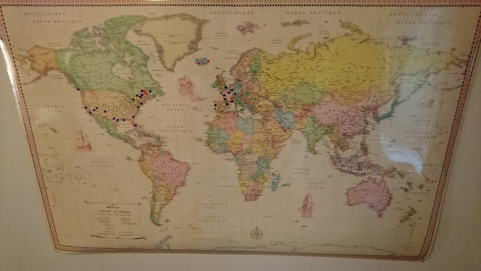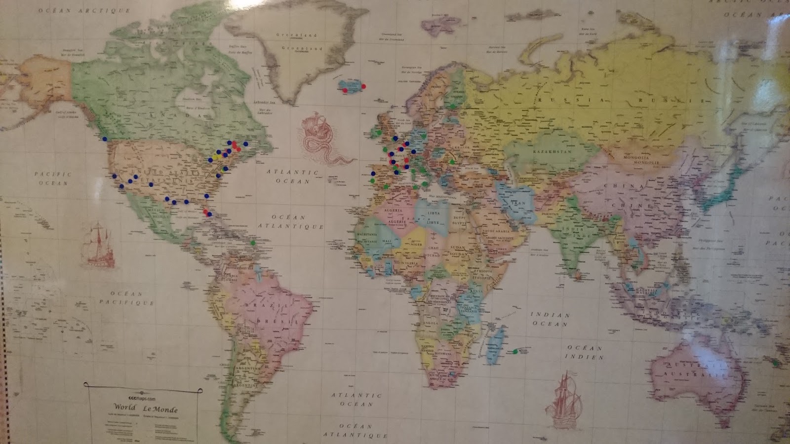 Dessus, on trouve des points de couleurs qui indiquent les lieux (villes/pays) que nous avons visité.