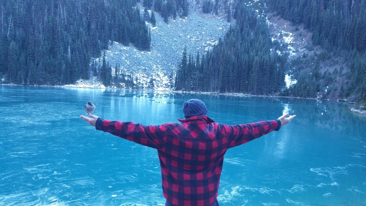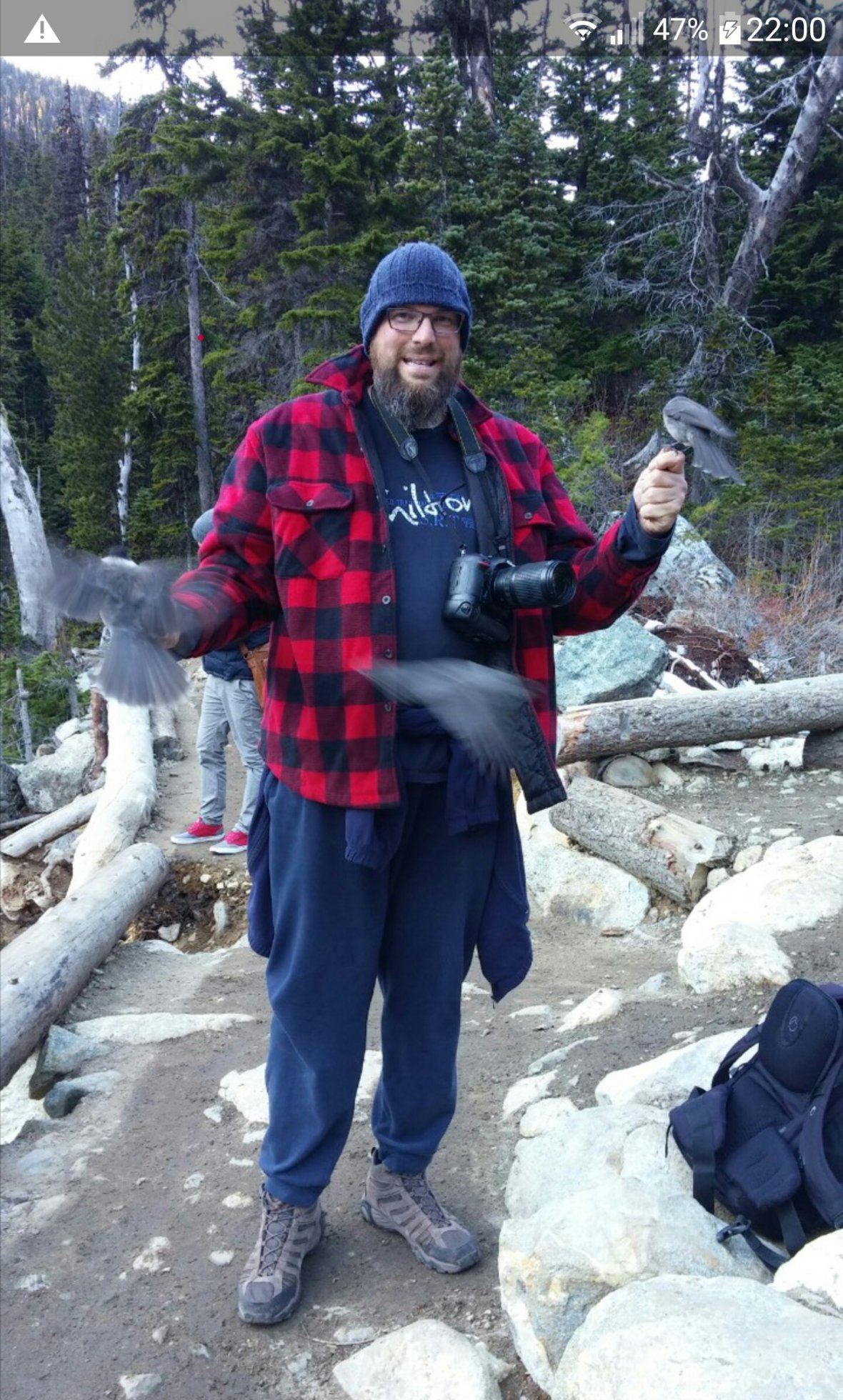 Pour cette photo, c’est une touriste qui m’a prise en photo et la caméra de mon cellulaire s’est mise à bugguer. On peut voir les oiseaux voler autour de moi et se poser sur mes mains.